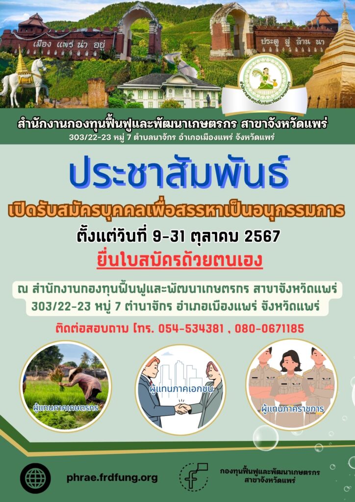 วันที่ 26 กันยายน 2567 เวลา 13.30 น. สำนักงานกองทุนฟื้นฟูและพัฒนาเกษตรกร สาขาจังหวัดแพร่ จัดประชุมคณอนุกรรมการกองทุนฟื้นฟูและพัฒนเกษตรกร จังหวัดแพร่ ครั้งที่ 8/2567 เพื่อพิจารณาดังนี้ 1.พิจารณารับรองผลการขึ้นทะเบียนเกษตรกร(หนี้) ประจำปี 2567 โดยมี นางเอมอร พรหมดี ประธานอนุกรรมการกองทุนฟื้นฟูและพัฒนาเกษตรกรจังหวัดแพร่ เป็นประธานการประชุม ณ ห้องประชุมสำนักงานกองทุนฟื้นฟูและพัฒนาเกษตรกร สาขาจังหวัดแพร่ ตำบลนาจักร อำเภอเมืองแพร่ จังหวัดแพร่